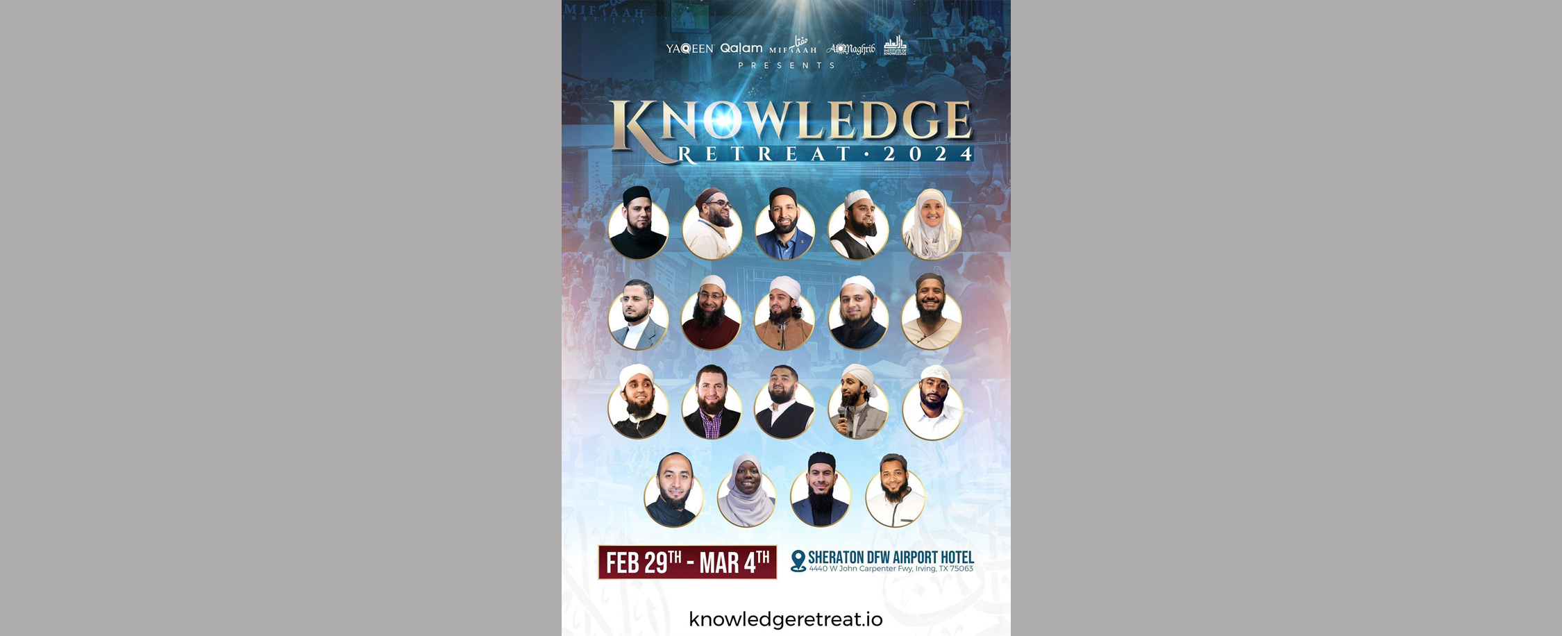 We are excited to host a 5 day Knowledge Retreat to immerse ourselves within the Quran and evaluate its gems and stories. Join us on February 29th -March 4th in Dallas, TX for an epic collaboration between Miftaah Institute, Yaqeen, Qalam, AlMaghrib Institute, and the Institute of Knowledge for the Knowledge Retreat : The Quranic Experience